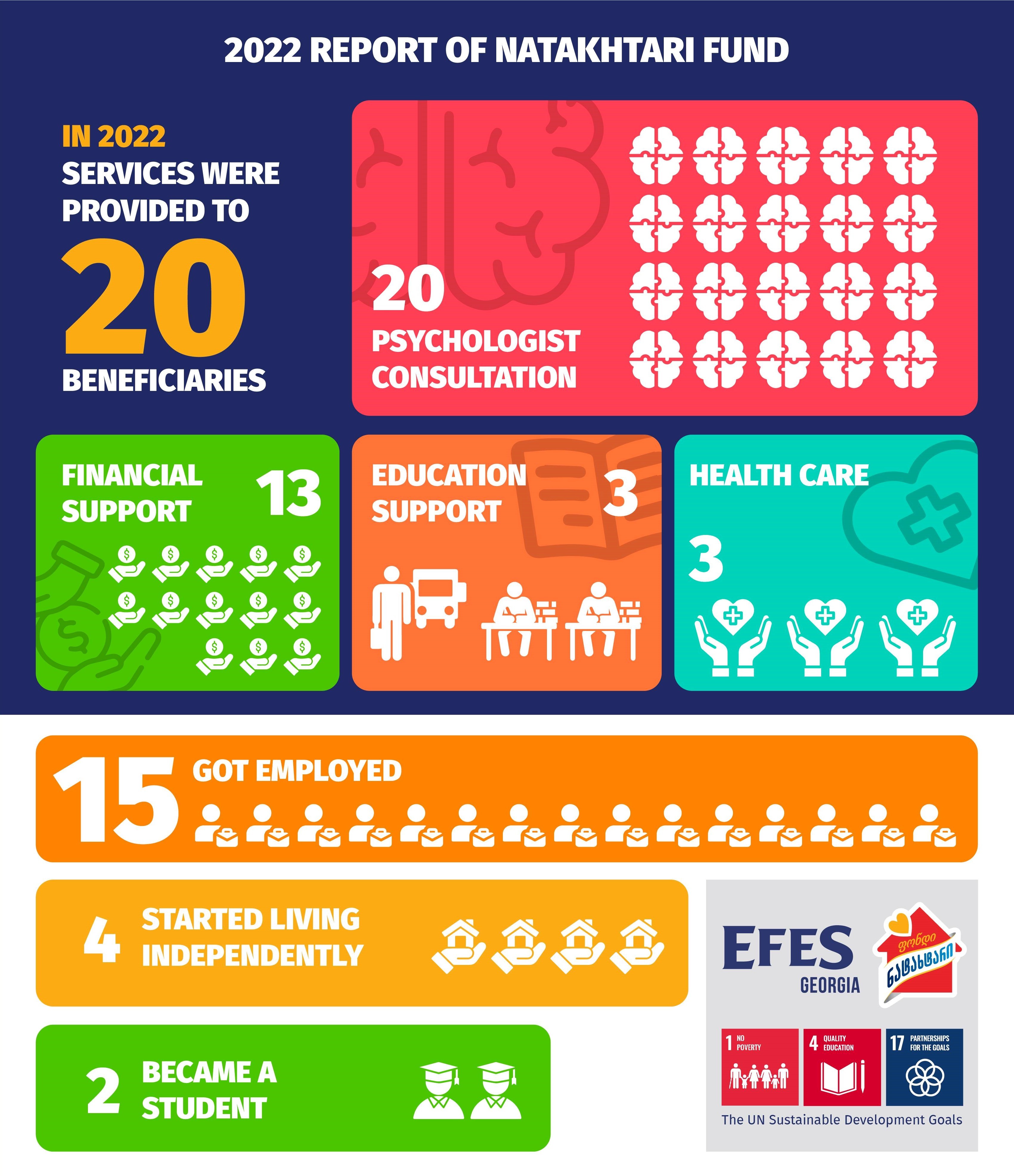 Ultimately, due to the activities of the Natakhtari Fund, in 2022, both fund beneficiaries enrolled in undergraduate programs, one at the elementary teacher education program and the other in the faculty of international relations. It is noteworthy that 15 out of 20 beneficiaries found employment. During the year, the association concluded its work with 4 beneficiaries, who had become capable of independent living with the fund's support.