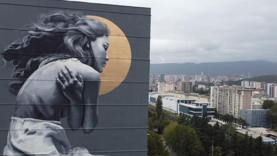 You will find this building in Didube, at 7 Eristavi Street. The dimensions of the work are unprecedented in the region and measures up to 60 meters, which makes it possible to view even from considerably distant spots. She used photography to create a modelling base for the painting, and continued working with acrylics and spray paint.