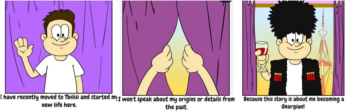 ‘’I have recently moved to Tbilisi and started my new life here. I won’t speak about my origins or details from the past. Because this story is about me becoming a Georgian!’’-that’s how the series of comics by Batoni Ucxoeli begins.