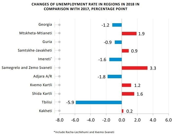 As for indicators from the regions, in 2018, as compared to 2017, the unemployment rate declined in Tbilisi, Adjara, Imereti and Guria.