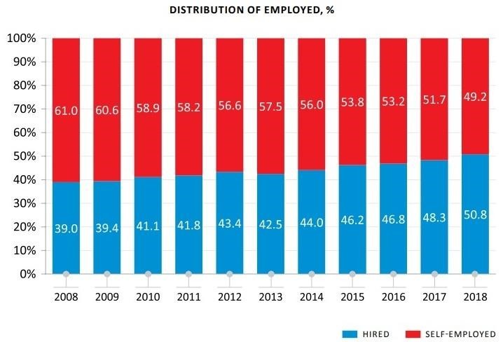 In 2018, the ratio of those hired in the total number of employees made up 50.8%, up 2.5% year on year. It is worth noting that, over the past 5 years, the number of self-employed is declining and , for the first time, the number of those employed exceeded the number of the self-employed.