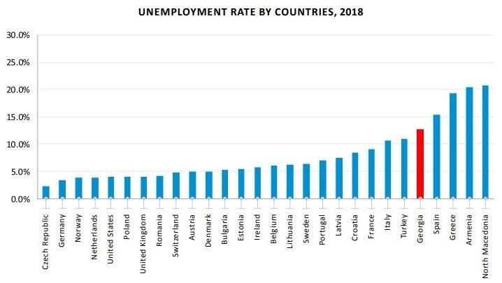 When compared to Georgia, lower employment rates are recorded in Spain, Greece, Armenia and other countries, but such countries as the Czech Republic, Germany, USA, Netherlands, Norway, Great Britain, Romania and Poland record full employment, i.e. the unemployment rate is below 5%.