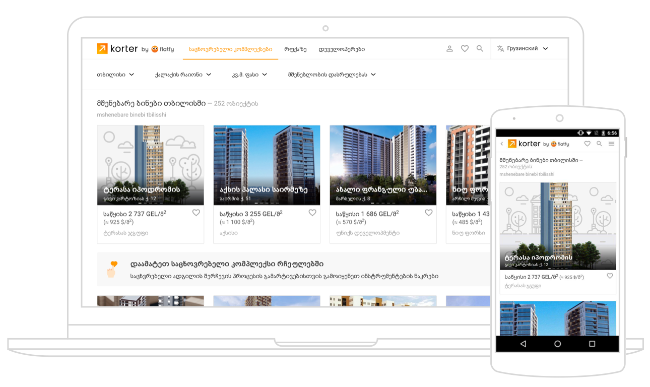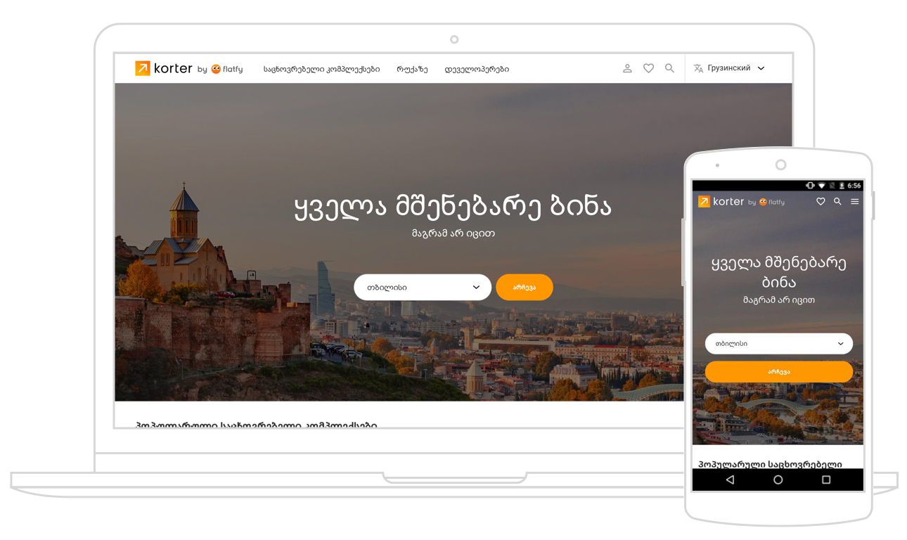 This platform in the Georgian market was launched as part of Flatfy real estate search service. And its main task is to collect reliable information on all new buildings in the country in one place. As a result, this service has become an effective tool for assessing the residential real estate in Georgia. After all, now potential buyers can explore the market situation themselves, see the best options, and also receive free legal support from the Korter team.